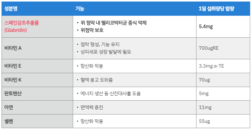 또한 함유된 성분들 중 비타민 A는 피부 및 점막을 형성하고 기능을 유지하는 영양소로, 위 상피세포가 정상적으로 형성되도록 도우며, 비타민K는 혈액응고를 도와 위벽의 출혈을 예방하며 궤양이 있는 경우 위장 장애 증상을 개선하는 효과가 있습니다.